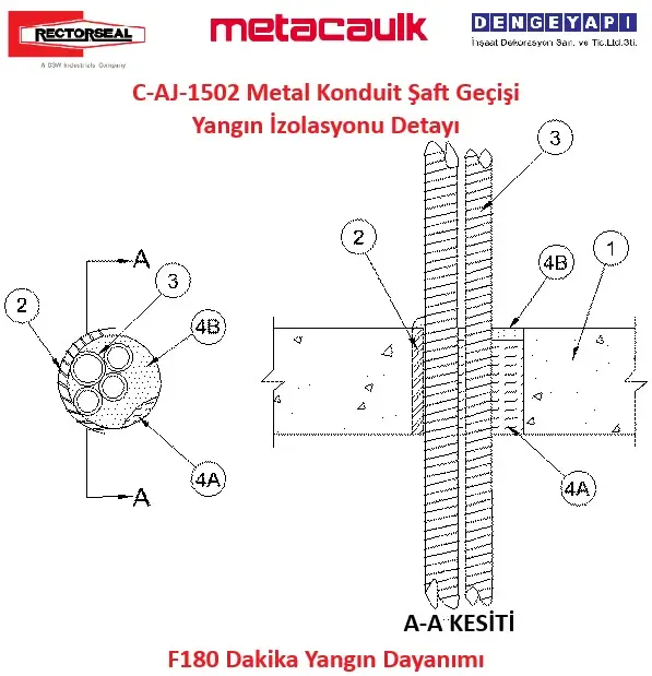 Bu yangın durdurucu detayı; ilgili pasif yangın durdurucu mastik ürünü kullanılarak şaft geçen metal boru 1-1/2" inç çapa kadar çelik konduit borunun geçmesi durumunda Yangın Durdurucunun F180 dakika yangın dayanımını temin ettiği UL tarafından test edilmiş ve sertifikalanmıştır. Uygulama şartlarında farklılık olması durumunda teknik birimimize başvurarak, farklı çözüm imkanlarını danışabilirsiniz.