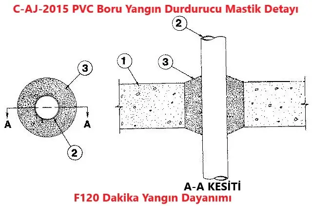 Şaft, Duvar veya Döşeme delip geçen PVC Boru Yangın Durdurucu Mastik Detayıdır. C-AJ-2015 nolu detayda Yangın Durdurucu Mastik Detayı MC 950 Yangın Durdurucu Mastik kullanıldığında F120 dakika yangın dayanımı elde edilmiştir.