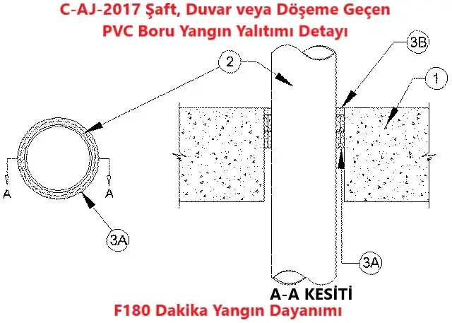 Şaft, Duvar veya Döşeme delip geçen PVC Boru Yangın Yalıtımı Detayıdır. C-AJ-2017 nolu detayda Yangın Durdurucu Mastik Detayı MC 1000 Yangın Durdurucu Mastik ve MC Yangın Durdurucu Sargı kullanıldığında F180 dakika yangın dayanımı elde edilmiştir.