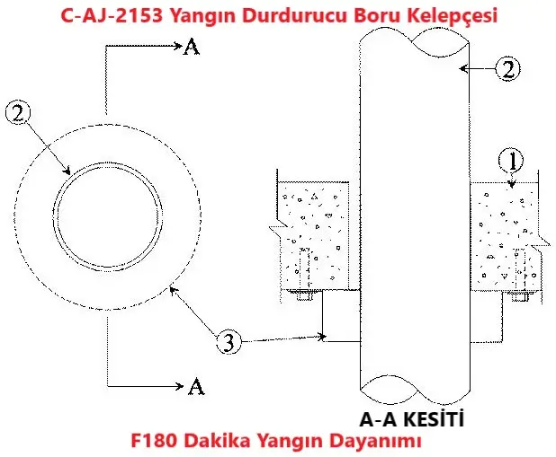 Şaft, Duvar veya Döşeme delip geçen PVC (Polivinil Klorür boru), CPVC (Klorlanmış Polivinil Klorür boru), ABS (Akrilonitril Bütadien Stiren) Boru, Yangın Durdurucu Boru Kelepçesi Detayıdır. C-AJ-2153 nolu detayda MC Yangın Durdurucu Kelepçe kullanıldığında F180 dakika yangın dayanımı elde edilmiştir.