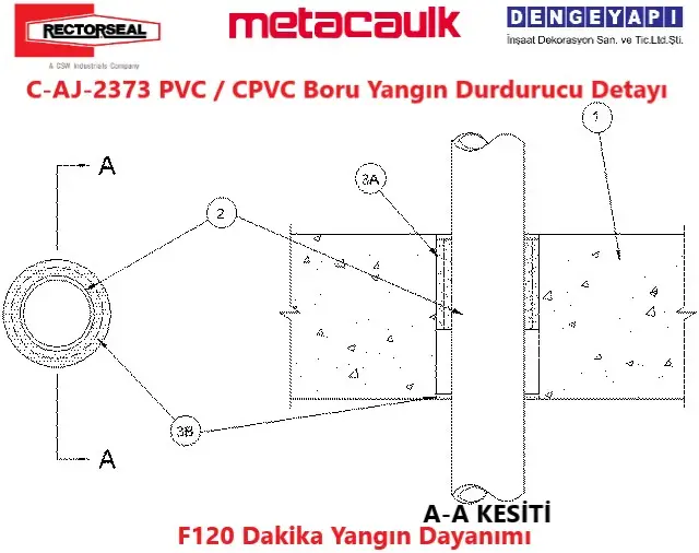 Bu detay, Yanıcı Nitelikte olan PVC / CPVC borular için geliştirilmiş Yangın Durdurucu Sargı Detayıdır. Betonarme Şaft, Döşeme veya Duvar geçişleri için, F120 Dakika yangın dayanımı, UL tarafından Yangın Testlerinden geçirilmiştir. C-AJ-2373 nolu detayda MC 1000 veya MC Sargı kullanıldığında F120 dakika yangın dayanımı elde edilmiştir.