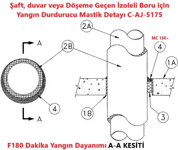 Şaft, Duvar veya Döşeme delip geçen İzoleli Boru, Yangın Durdurucu Mastik Detayıdır. C-AJ-5175 nolu detayda MC Yangın Durdurucu Mastik kullanıldığında F180 dakika yangın dayanımı elde edilmiştir.