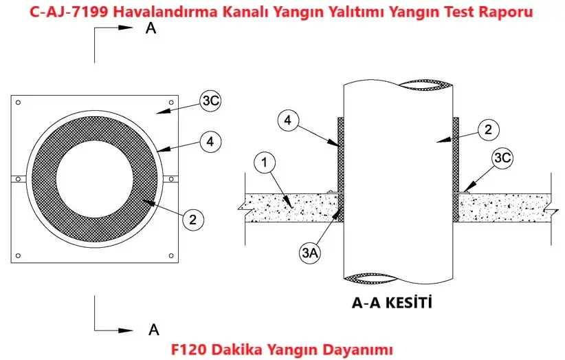 Döşeme veya Duvar Geçen Havalandırma Kanalı tesisat deliğinde Yangın yalıtımı uygulama detayı C-AJ-7199 için MC1000 Yangın Durdurucu Mastik kullanıldığında F120 Dakika Yangın Dayanımı Temin Edilmiştir.