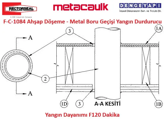 Ahşap Döşemeden Geçen EMT / Çelik / Döküm veya Bakır Boru için yangın durdurucu uygulama detayıdır. F-C-1084 nolu detay MC150+ Yangın Durdurucu Mastik ile yapılmaktadır. F120 Dakika Yangın Dayanımı Sağlamıştır.