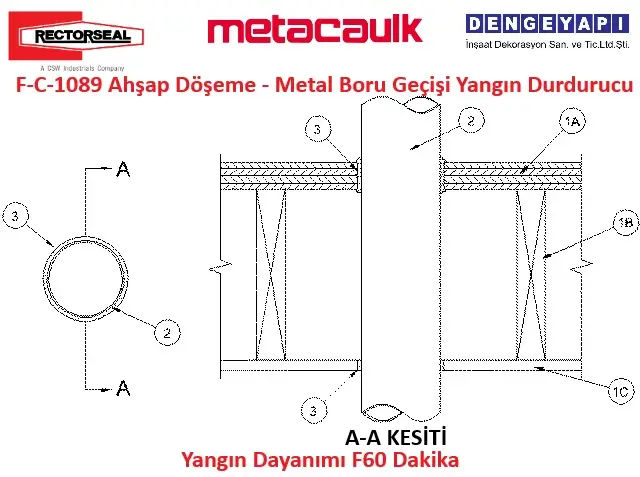 Ahşap Döşemeden Geçen EMT / Çelik / Döküm veya Bakır Boru için yangın durdurucu uygulama detayıdır. F-C-1089 nolu detay MC150+ Yangın Durdurucu Mastik veya MC1000 Yangın Durdurucu Mastik ile yapılmaktadır. F60 Dakika Yangın Dayanımı Sağlamıştır.