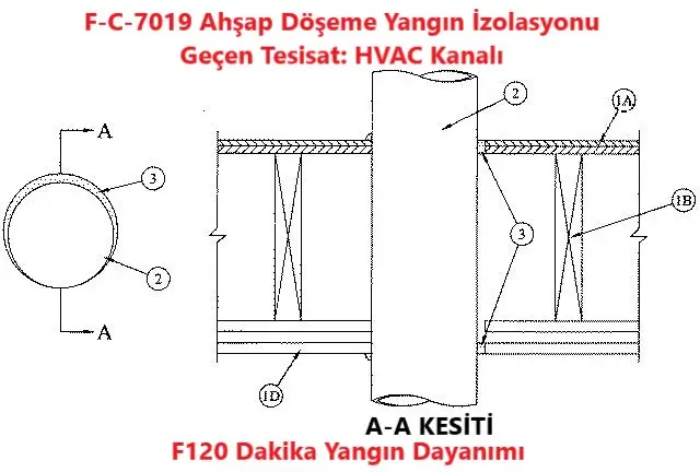 Ahşap Döşeme geçen HVAC Kanalı için Yangın İzolasyonu Detayı F-C-7019 nolu test raporuna göre, MC 150+ Yangın Durdurucu Mastik Kullanıldığında F120 dakika Yangın Dayanımı Sağlanmıştır.