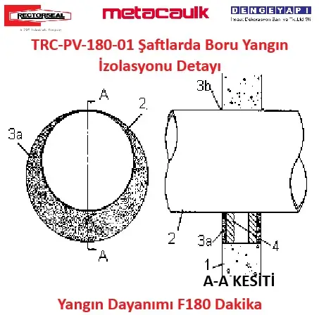 Şaft Duvarı delip geçen Yalıtımlı Boru Yangın Durdurucu Mastik Detayıdır. TRC/PV 180-01 nolu detayda MC 950 Yangın Durdurucu Mastik kullanıldığında F180 dakika yangın dayanımı elde edilmiştir.