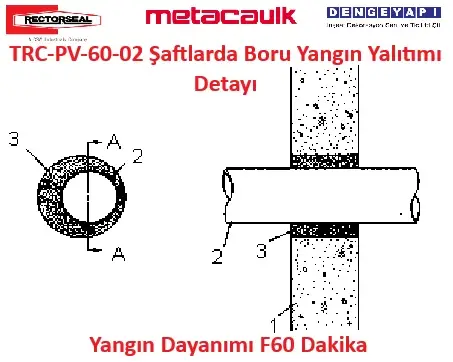 Şaft Duvarı delip geçen Alüminyum Boru Yangın Durdurucu Mastik Detayıdır. TRC/PV 60-02 nolu detayda MC 950 Yangın Durdurucu Mastik kullanıldığında F60 dakika yangın dayanımı elde edilmiştir.