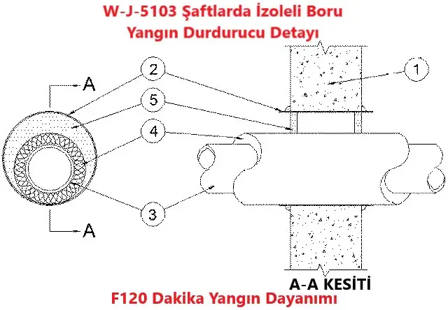 Şaftlardan geçen İzoleli Boru Yangın Durdurucu Detayıdır. W-J-5103 nolu detayda MC 1000 Yangın Durdurucu Mastik kullanıldığında F120 dakika yangın dayanımı elde edilmiştir.