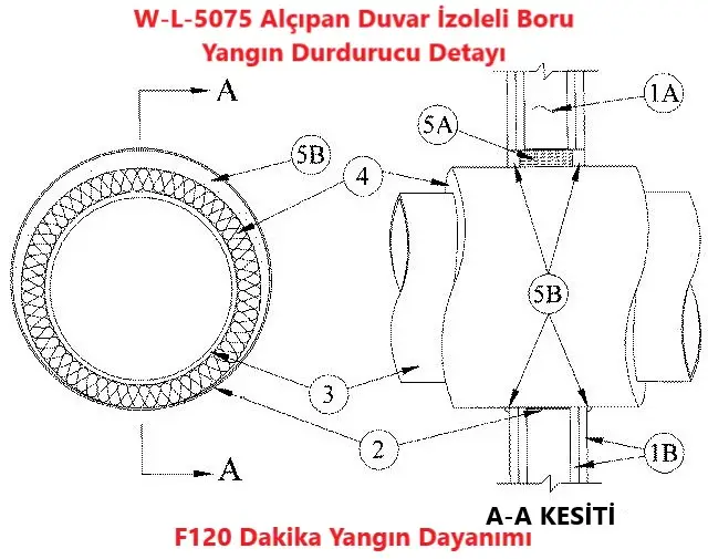 Alçıpan Duvar İzoleli Boru Yangın Durdurucu Detayıdır. W-L-5075 nolu detayda MC 1000 Yangın Durdurucu Mastik kullanıldığında F120 dakika yangın dayanımı elde edilmiştir.