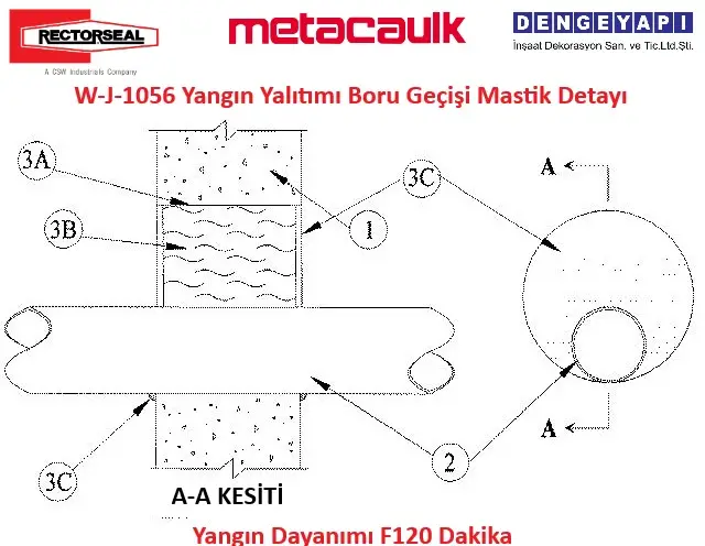 Şaft, Duvar delip geçen metal boru için Yangın Durdurucu Boru Geçişi detayı W-J-1056 uygulamasında MC150+ Yangın Durdurucu Mastik kullanılmış ve F120 Yangın Dayanımı Temin edilmiştir.